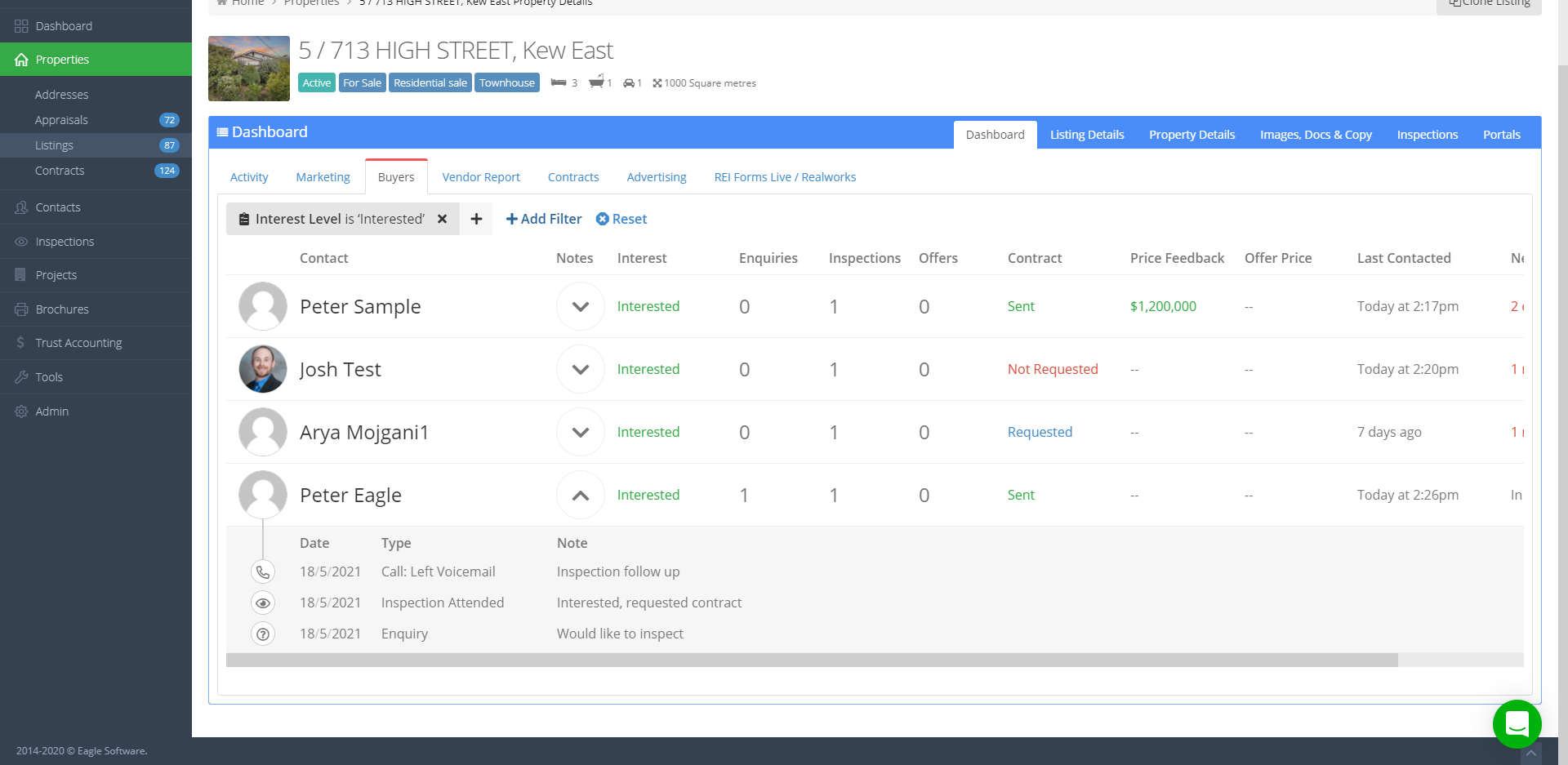 View the contacts interest level, contract request status, inspections, offers and price feedback.