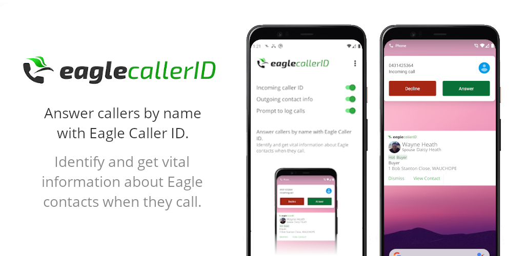 We are excited to release a new Eagle Caller ID app for Android (iOS coming soon). With Eagle Caller ID, incoming calls from Eagle contacts can be identified with ease. Create a friendly and professional experience for contacts by answering callers by name. When a contact calls, a pop up notification shows with the contacts: