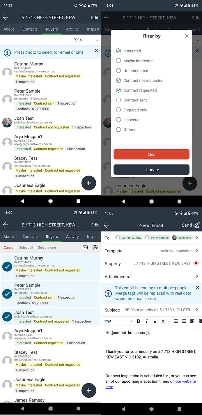 Send bulk email or SMS messages to your buyers quickly and easily. Tap on buyer photos to select them, or tap 'Select all' on a filtered list of buyers to select a list of buyers to communicate with.