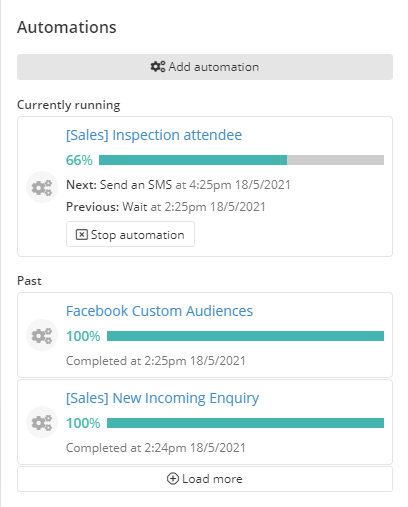 - Added activity feed items 'Automation SMS' and 'Automation Email' to new activity feed to assist with distinguishing them from user generated SMS/emails. Includes link to automation tracker to see which step the automation is up to. Applies to automation generated SMS/email going forward.