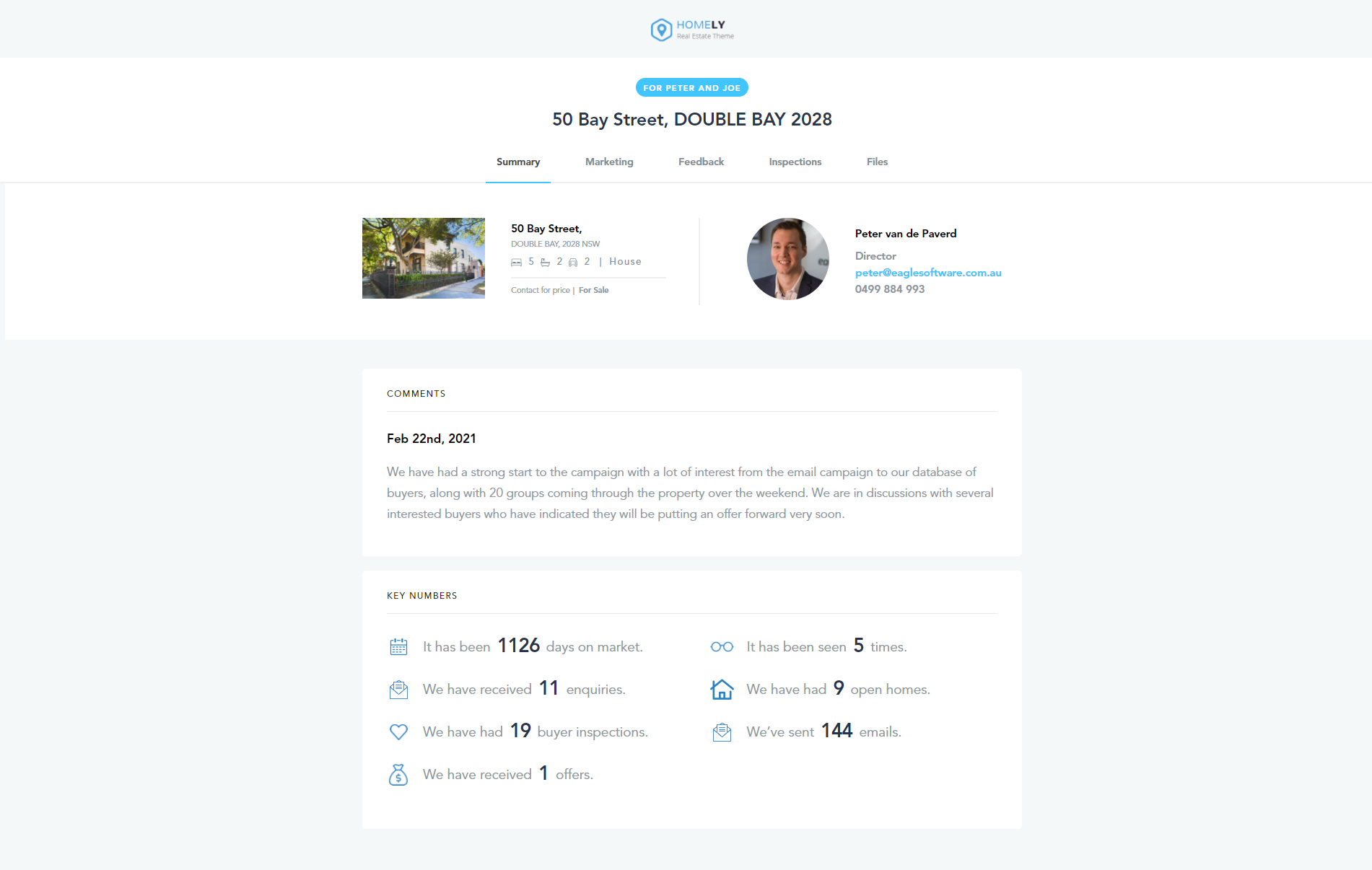 - Property and Agent section which shows key property details along with agent contact details