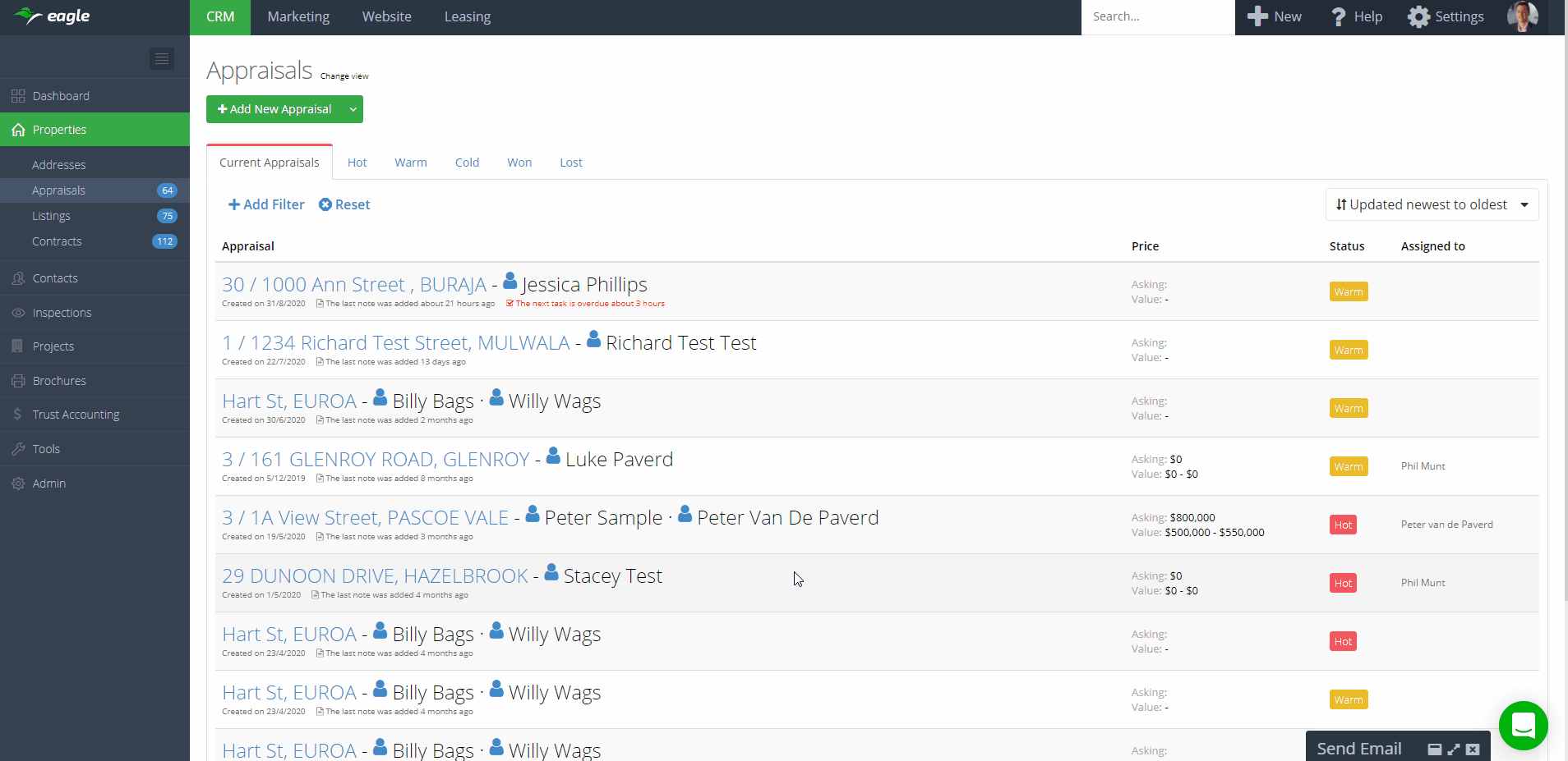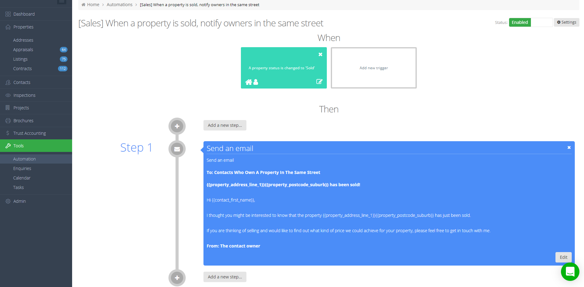 - Upgraded the automation action 'send an email' to be able to send to 'contacts who own a property in the same street'. Use this to automatically notify owners in your database of new or sold listings in their street.