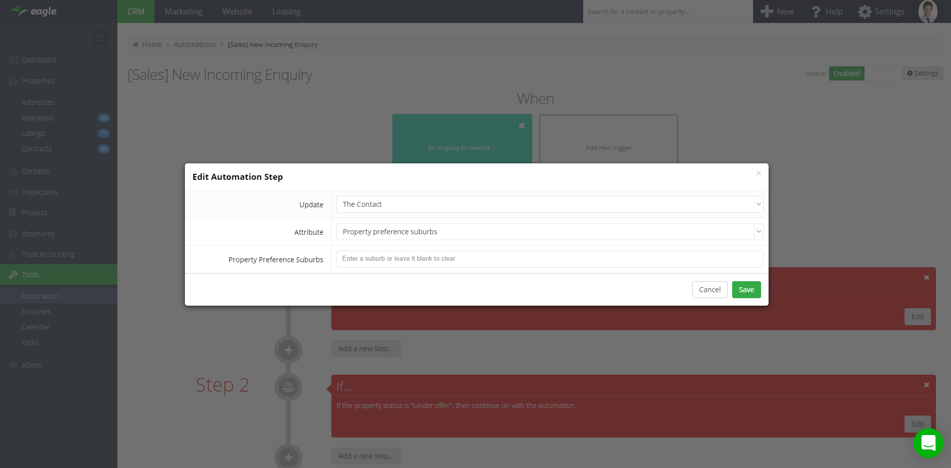 - Updated automation step 'Update Field' so it can now set or clear the suburb of a contact's property preferences. Use this on 'New Incoming Enquiry' or 'Inspection Attendee' automations if you don't want property alerts to match based on suburb.