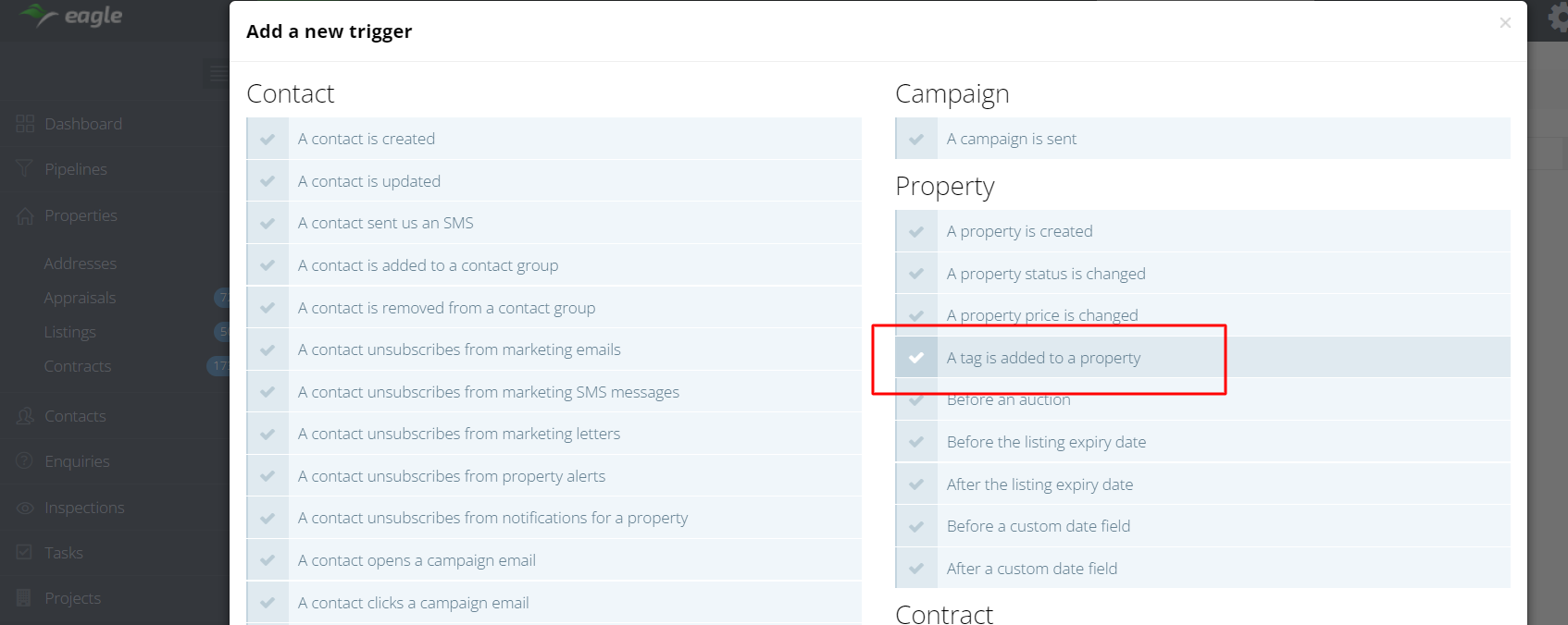 - Added a new trigger ‘when a tag is added to a property’. With this new feature, you can trigger automations when any or a certain tag is added to a property and set up flows to create tasks, send emails, create deals, and much more.