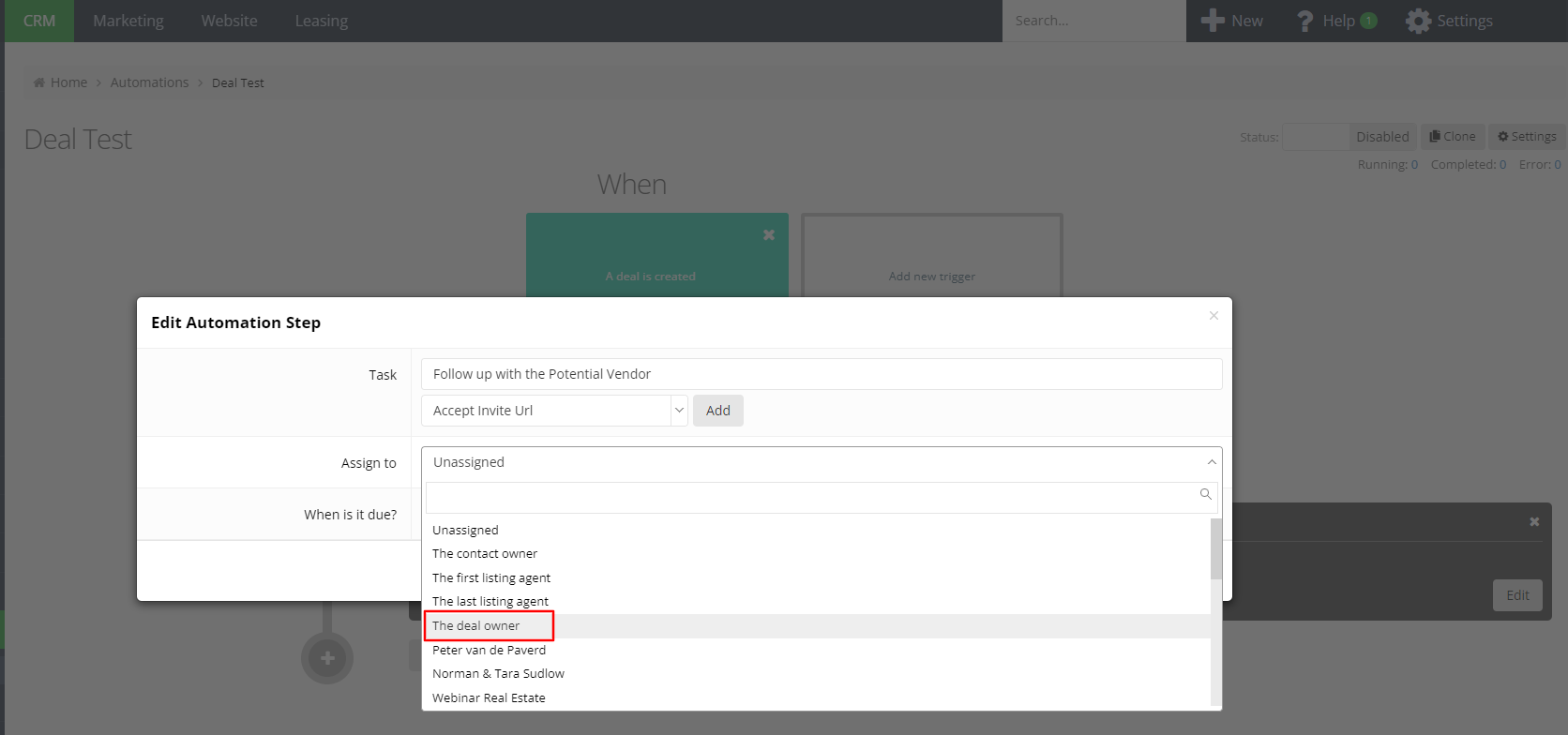 - Assigning tasks to deal owners is now possible when using a deal trigger and creating a task in the step. This feature provides better task management by assigning tasks to the deal owner.