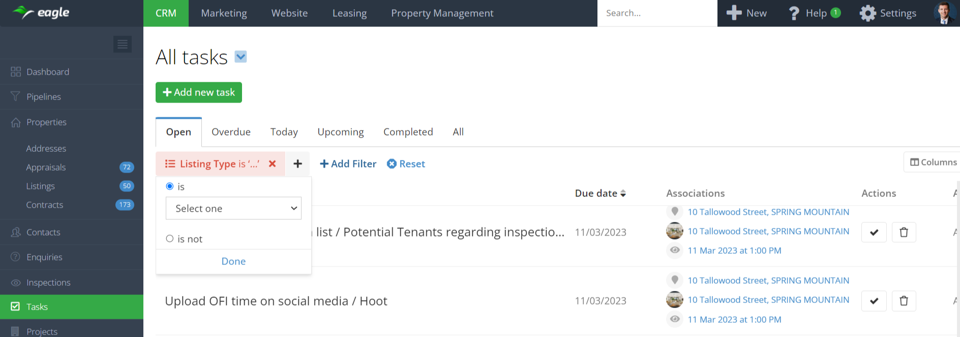 - Added Listing Type filter on the Tasks screen with ‘is’ and ‘is not’ filter strategies. With this filter and filter strategies, you can easily filter tasks based on the type of listing the task is associated with, for eg. viewing all the tasks associated with sale listings.