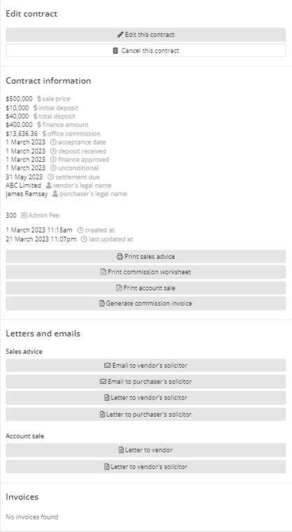 Under the Letters and Emails section, you can easily generate sales advice and account sale letters and emails pertaining to the contract.