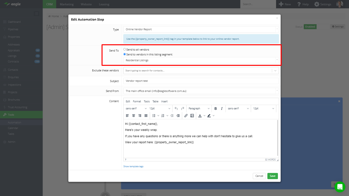 - Upgraded the ‘Send vendor reports’ and ‘Send landlord reports’ automation action to send reports based on listing segments. Use this to scope which vendors or landlords you’d like to receive reports by the automation. eg. exclude vendors of commercial or business listings by only sending reports to vendors in the ‘Residential listings’ segment