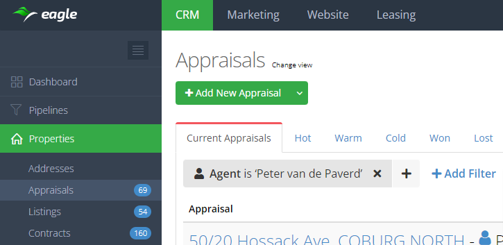 - Added a new Appraisal > Agent filter. Now you can filter appraisals based on which agents have been added to the appraisal (in addition to existing functionality to filter based on the user who the appraisal belongs to)