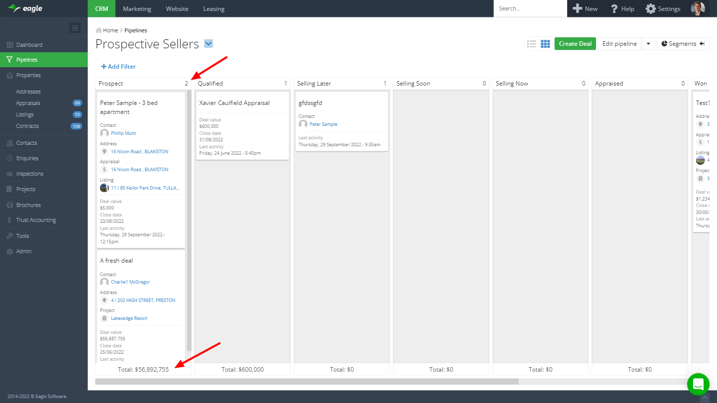 - Added deal count and deal value total to Pipeline stage columns when in the ‘board view’. Use these totals to get quick insights as to how much potential revenue and how many deals you have at each stage
