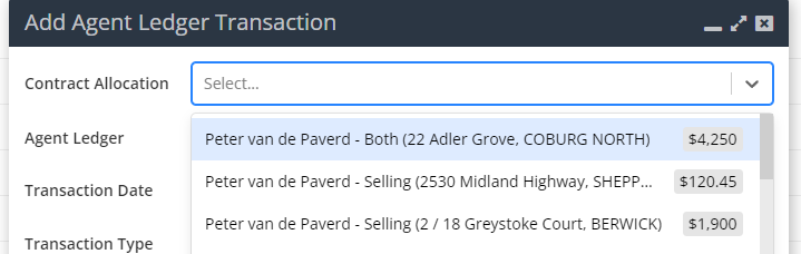 - Added the ability to select a Contract Allocation when adding an Agent Ledger credit transaction. Previously the only way to add a credit from a contract allocation was clicking the ‘Pay To Agent Ledger’ button from the Commission tab of a contract. With this update you can now make payments from contract allocations to agent ledgers from the one screen in the Agent Ledgers section.